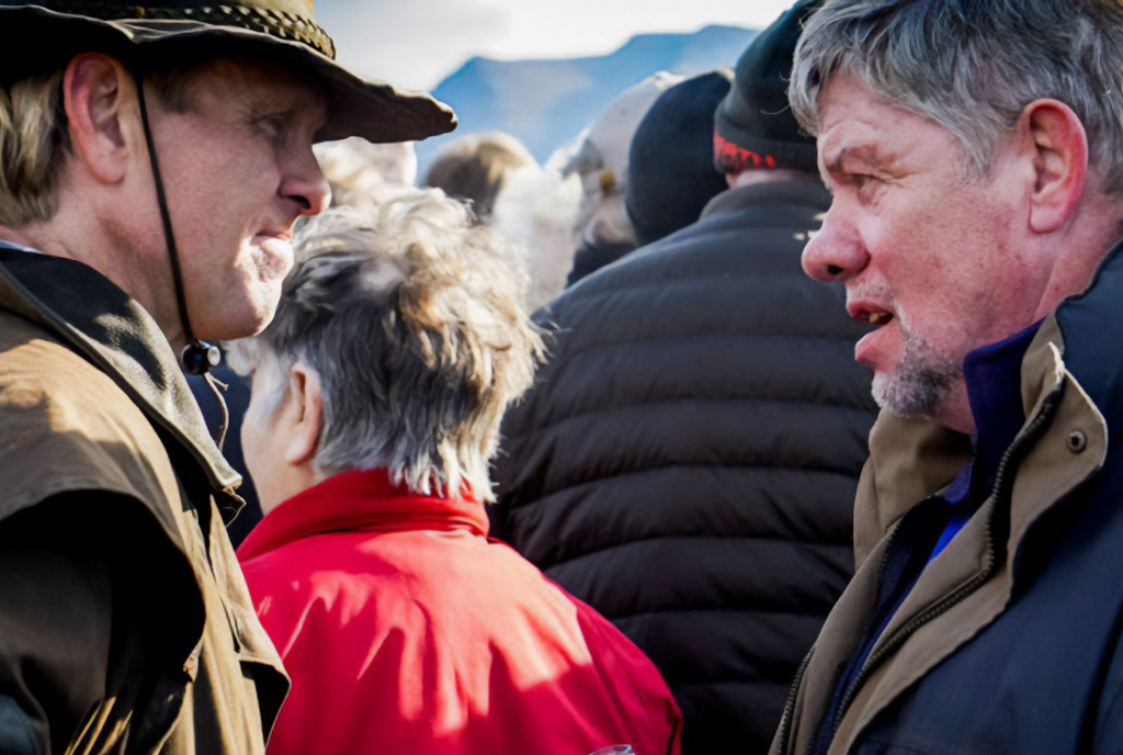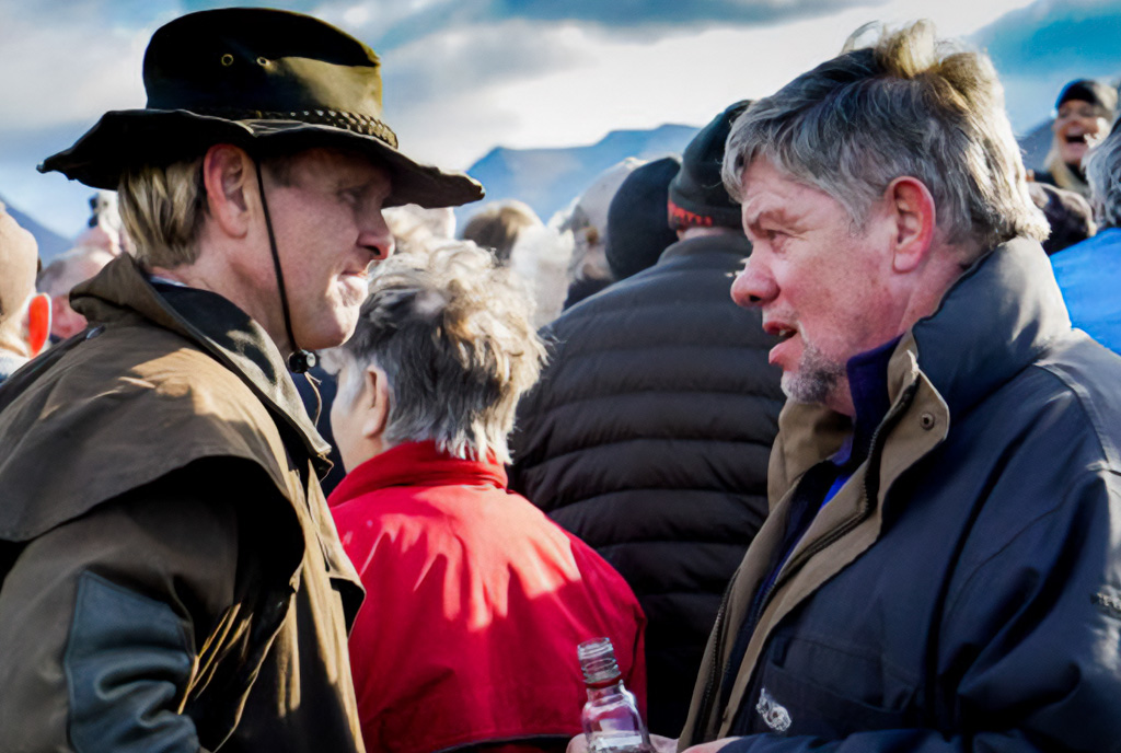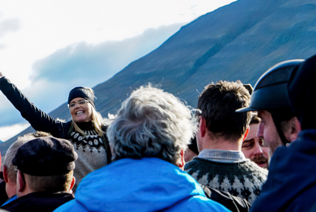 Поки фермери старанно працюють, група чоловіків у пласких кепках, одягнених у традиційні вовняні светри, зібралися в коло поруч із загоном і співають традиційні ісландські пісні.