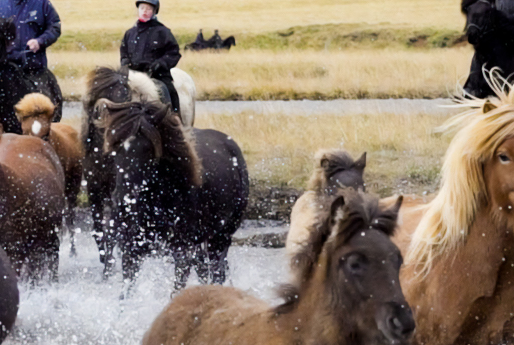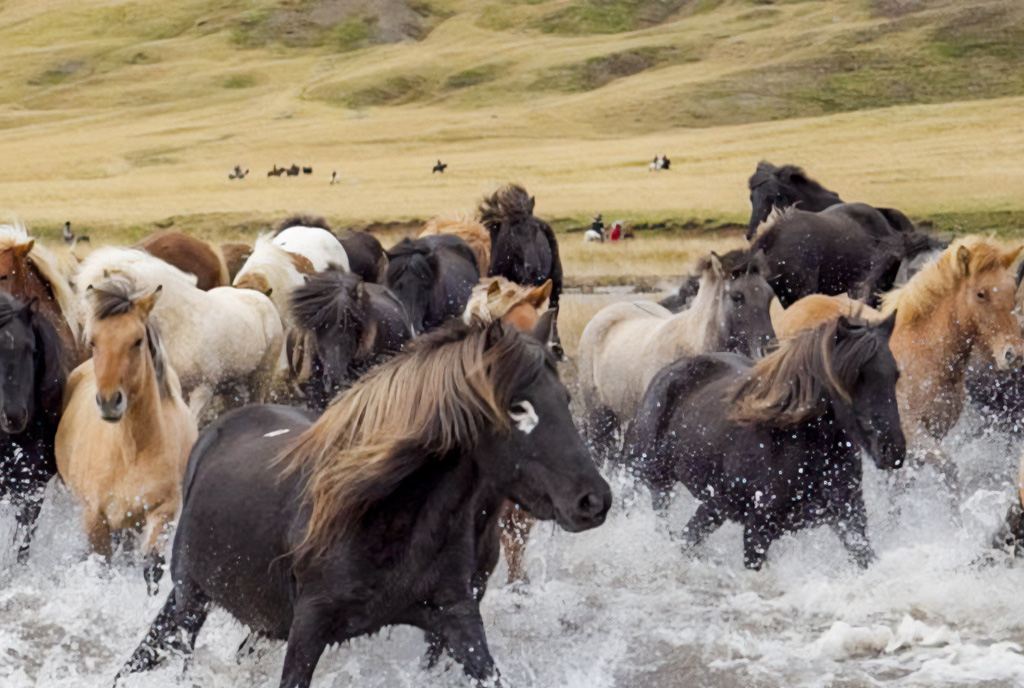Ісландські вівчарки гавкають на щиколотки коней, коли вони вміло допомагають своїм господарям і господиням зібрати сотні коней і перетнути річку єдиним строєм.
