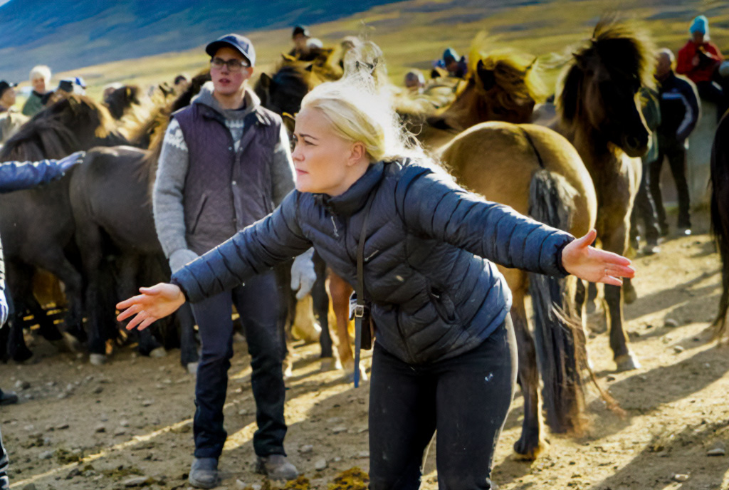 Вершники, як фермери, ісландці, так і туристи, виїжджають о 12 годині дня, щоб почати зганяти коней в одну велику групу. Сидячи верхи на своїх конях, які утримувалися протягом літа для верхової їзди, фермери носять чорні штани для верхової їзди, товсті пальта, рукавички та шоломи для захисту від холодного вітру, коли вони галопом скачуть рівнинами, збираючи тварин разом.